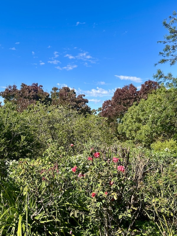Autumn view from my kitchen window – late roses, Claret Ash, and this glorious blue sky